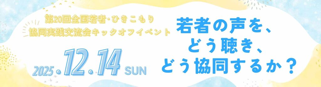 2026年12月に開催される「全国若者ひきこもり協同実践交流会・関東大会」に向けて、キックオフイベントを企画しています。キックオフイベントでは、ひきこもり経験者、家族、支援者が一堂に会し、それぞれの声に耳を傾けあいながら、協同のあり方を探るパネルトークの実施を計画します。聴いている人たちの協同のイメージが広がる場を目指します。